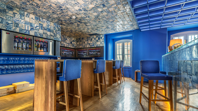 The décor, with the theme wine by the glass as inspiration, combines the royal blue with vintage furniture and beautiful panels of tiles from the 19th century, which takes us back to the Noble Houses in Douro.